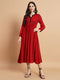 RED V-NECK DRESS WITH PINTUCKS AND CONTRAST NECK